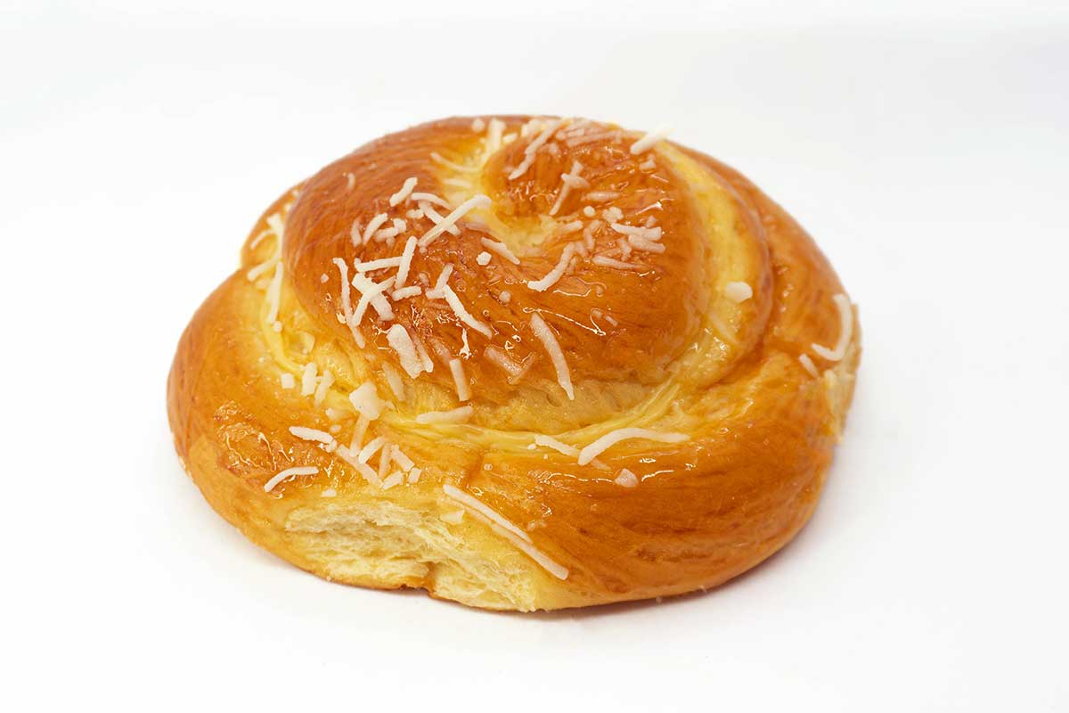 Esponjoso bizcocho tradicional relleno con crema de leche y un toque de ralladura de coco.